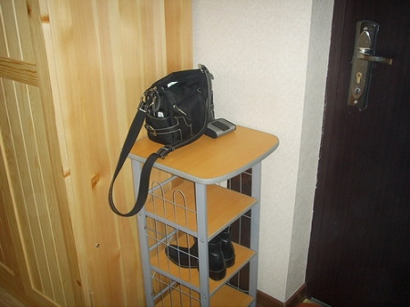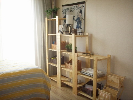 推門進去,就是一個小鞋架子,干凈整潔,進門的小地兒。房間雖小,還是要把它整得整齊點,為了門口換鞋和放雜物的需要,把大衣柜搬到這兒和這個假子一起組成一個小小玄關。