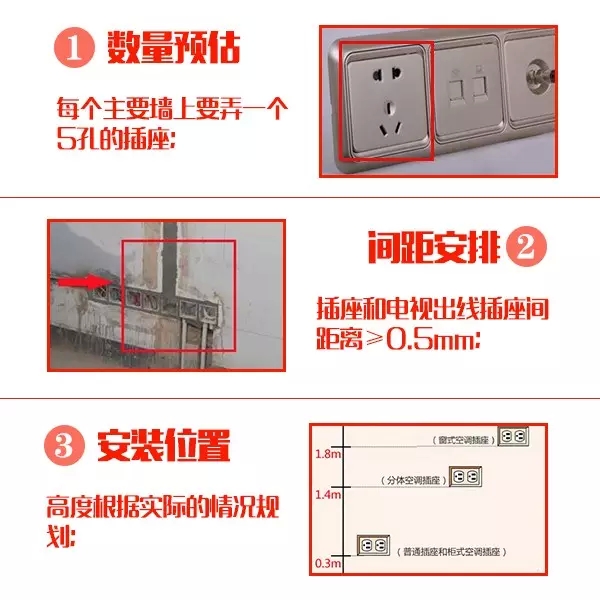 客廳與臥室的插座,應保證每個主要墻面均有一個5孔插座,以滿足日常生活所需。插座的位置應根據房屋的設計來確定,如電視背景墻位置的插座可適當多一些,其他位置的根據需要而定。