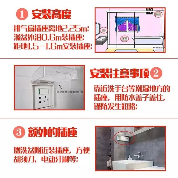 安裝在衛生間的插座宜帶開關和指示燈,如果安裝在潮濕位置的插座,好在插座表面安裝一個防水的蓋子,避免水汽進入插座內,引起短路。
