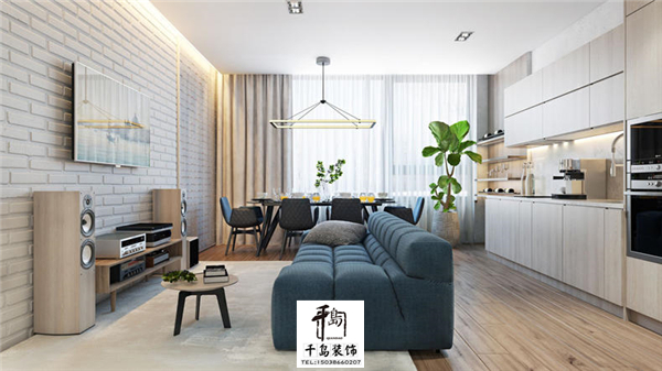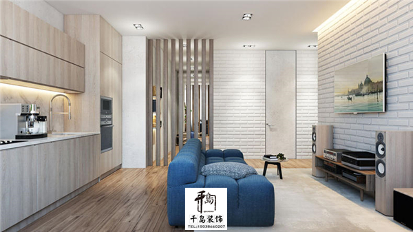 一塊大大的蒼白的地毯把空間很好的隔了開來,淡色的地毯上放上一款藍色的大沙發,周末的下午這就是懶癌患者好的終結地點。但是電視背景和音響的顏色都和廚房柜子的顏色相同,顏色的統一讓空間顯的更大,窗臺下的一盆天然綠植給家增添一絲生氣,更有生命力。