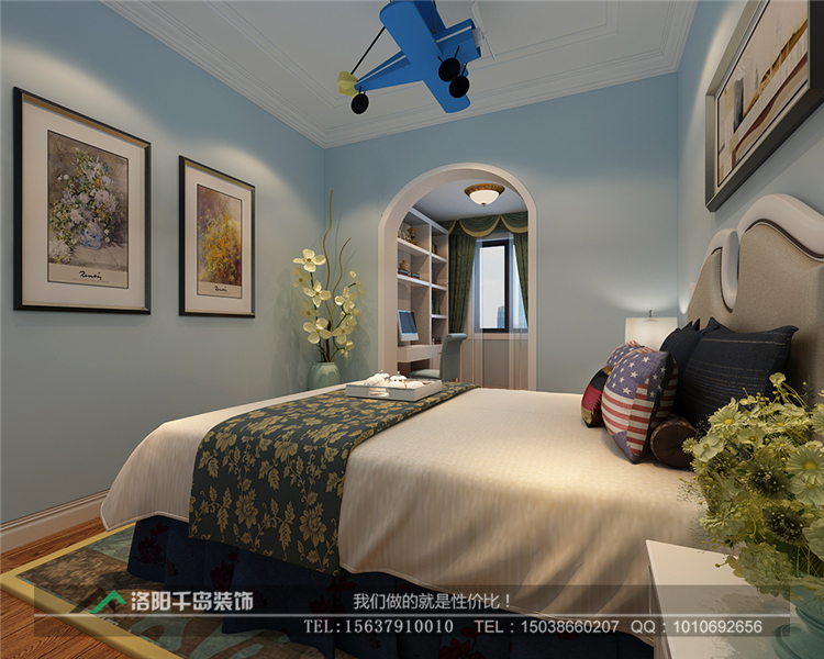 歐式兒童房,清爽的顏色搭配,讓整個(gè)房間更加清新自然。讓人仿佛置身于北歐的森林中。簡約清新的飛機(jī)吊燈設(shè)計(jì),讓房間在利用上變得更加靈活。