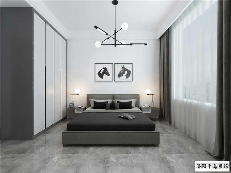 主臥采用典型的黑白灰裝修風格,白色整體定制衣柜,滿滿的高級感,床頭硬包簡約大方,配上金色的金屬燈具,效果不要太贊了!