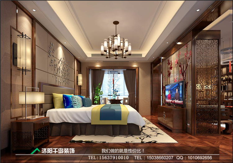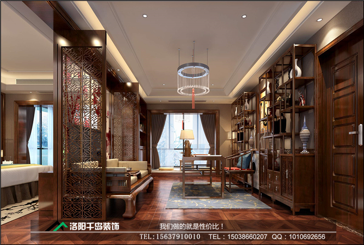 臥室就是個人休息的地方,所以在用色方面盡量穩(wěn)重而不跳躍,讓人能靜下心來,床頭的中式木花格配合荷花形狀裝飾品體現(xiàn)中式韻味。另外主臥室與書房之間鏤空花格隔斷,茶色與木色是書房的主調,虛實有致的結構讓小空間也充滿趣味。洛陽開元名郡225㎡復式新中式裝修案例@二樓臥室兼書房