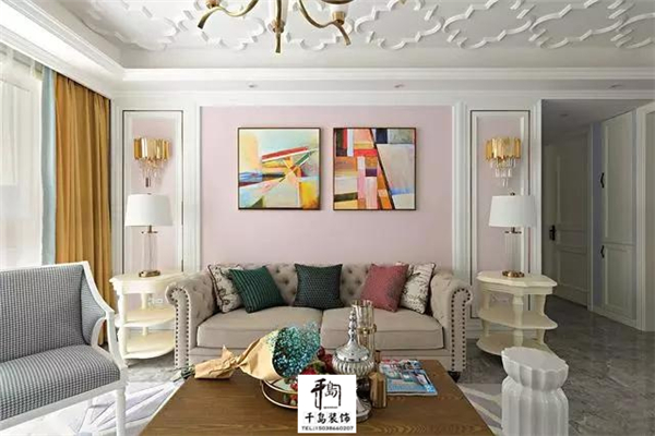 進入客廳是淡粉色的墻面,搭配金色的窗簾,以及幾何的裝飾畫,來點綴空間從而使空間的色調更加的豐富。