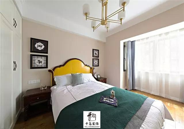 素雅的臥室,黃色的床頭點亮整個睡眠空間的色調,陽光透過薄紗般的窗簾照射在潔白的床上是那么的溫暖舒適。