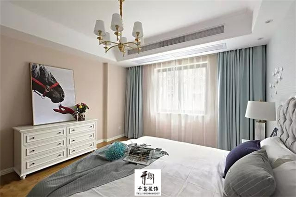 主臥的設計繼續延續素雅,這樣的睡眠空間更好的入睡。馬頭的裝飾畫為空間營造出一份藝術的氛圍。