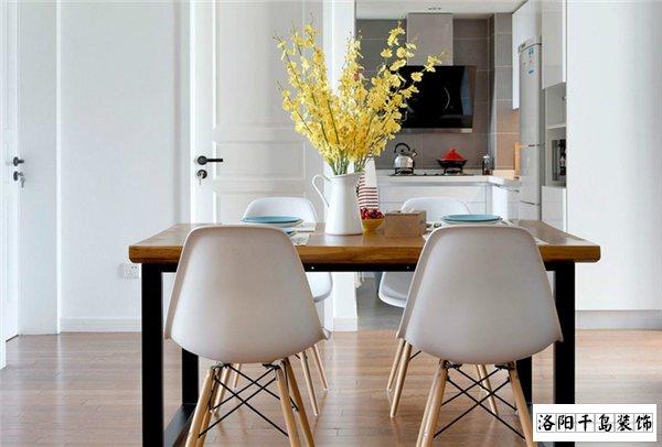 餐廳的空間不大,在廚房與客廳的過渡區,硬裝為白色的墻面,原木色的地板,與整體風格契合,既樸實又簡潔。餐桌選用非常經典的北歐風格,不刻意修飾的桌面板材,配上粗壯的鐵藝腿部支撐,兼具了時尚和工業風的格調,再配上造型前衛的休閑椅,令這個空間雖然簡單卻不孤單。桌面用陶瓷花瓶,配上鮮艷的仿真絹花裝點,給這塊空間帶來明媚的色彩。