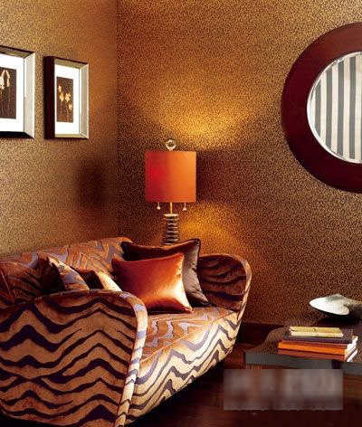 造型獨特的斑馬紋沙發透著奢華,紅色的臺燈有一種宮燈的韻味,在柔和的燈光和暖色墻紙的烘托下,讓客廳里的奢華氣氛慢慢彌散晚開來。