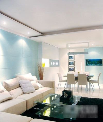 在這個客廳中,吊頂上的小射燈有效補充了光線,同時在沙發背景墻上形成一道美麗的弧形光暈。